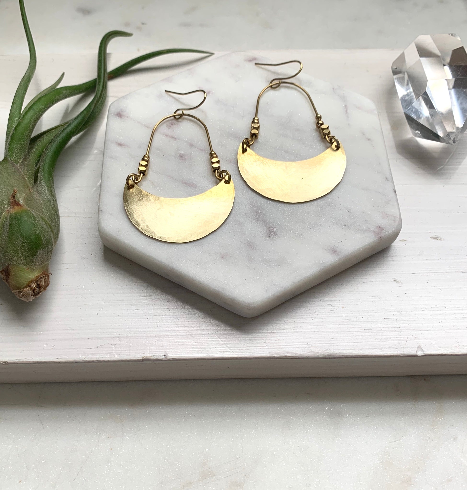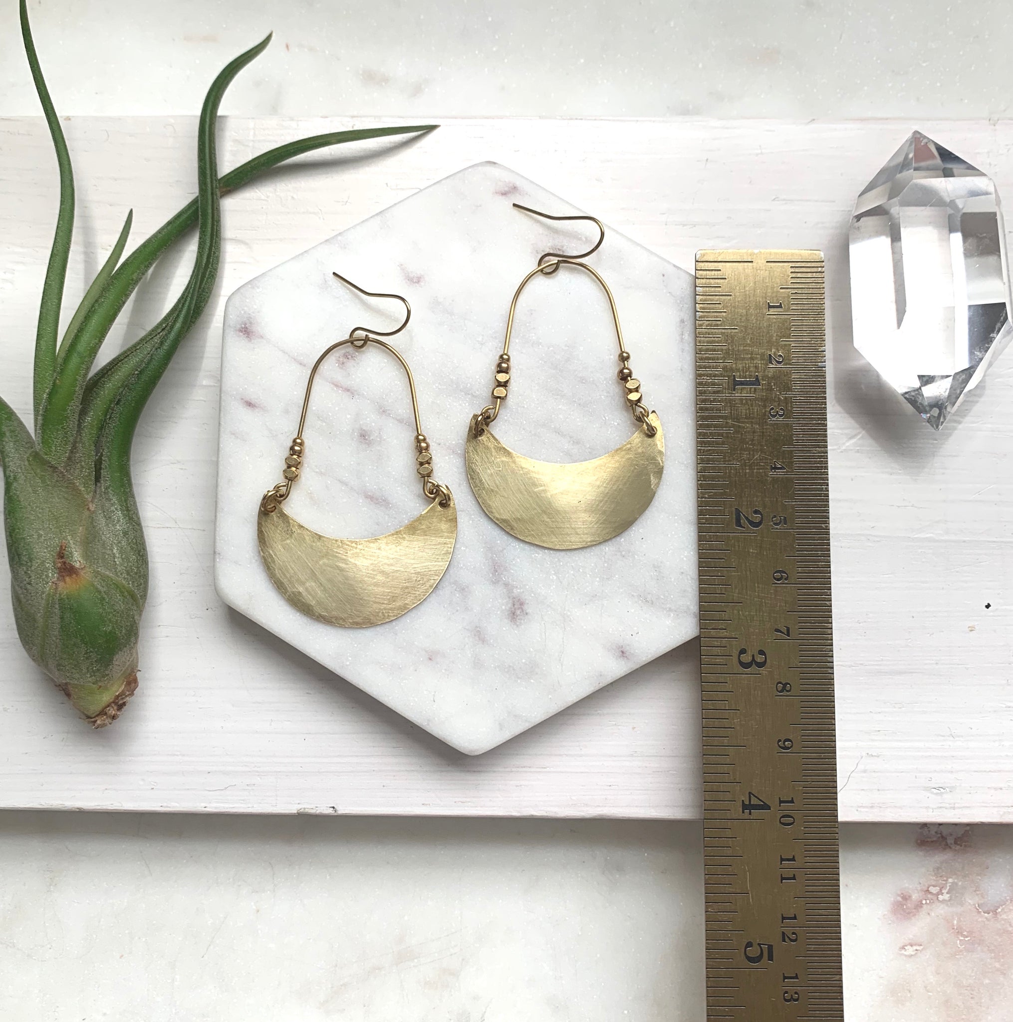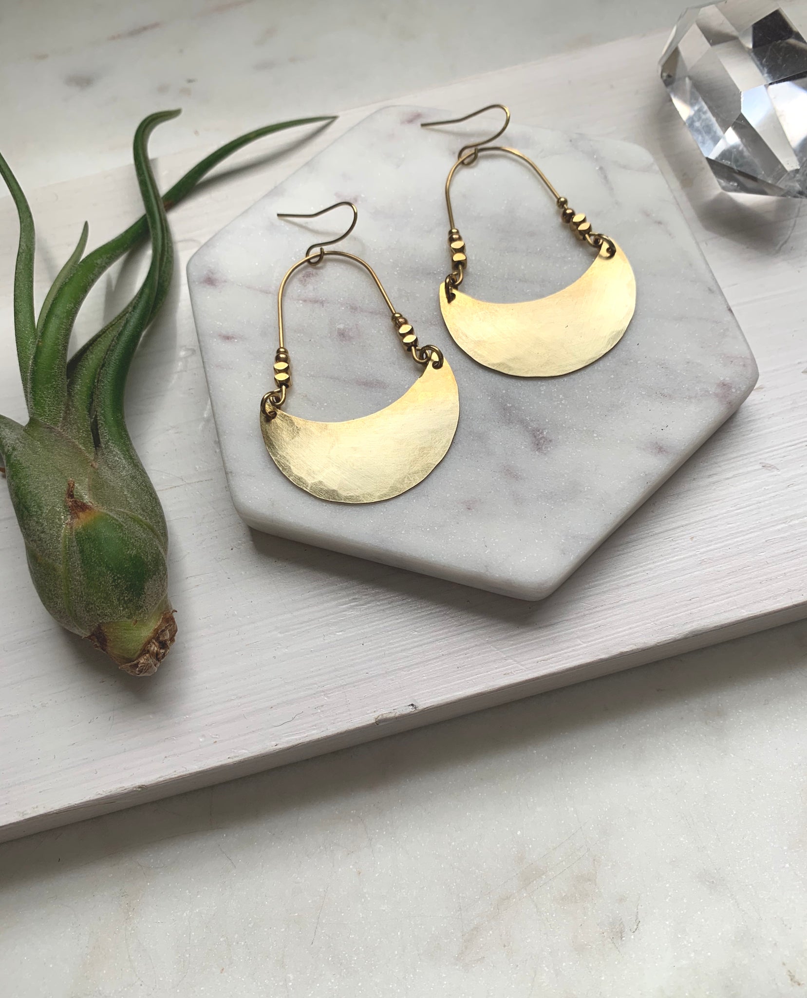 Hammered raw brass elements combined to create these boho crescent statement earrings