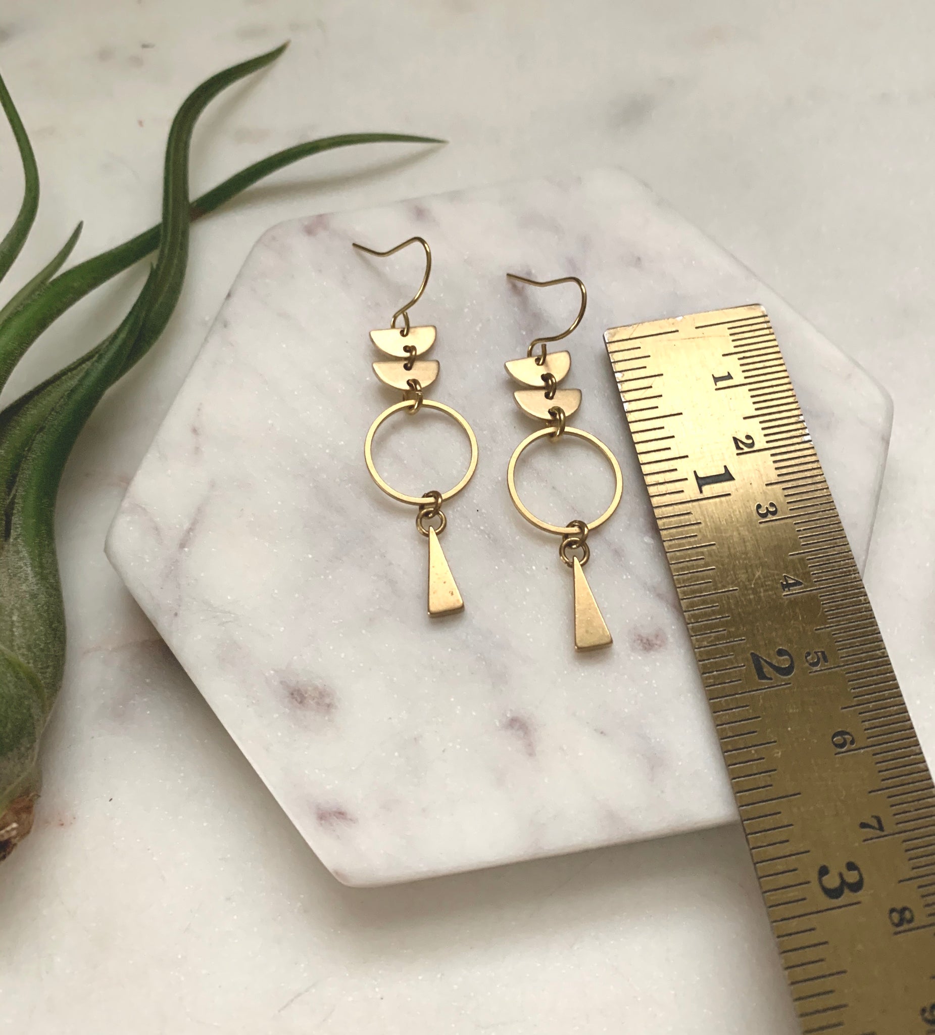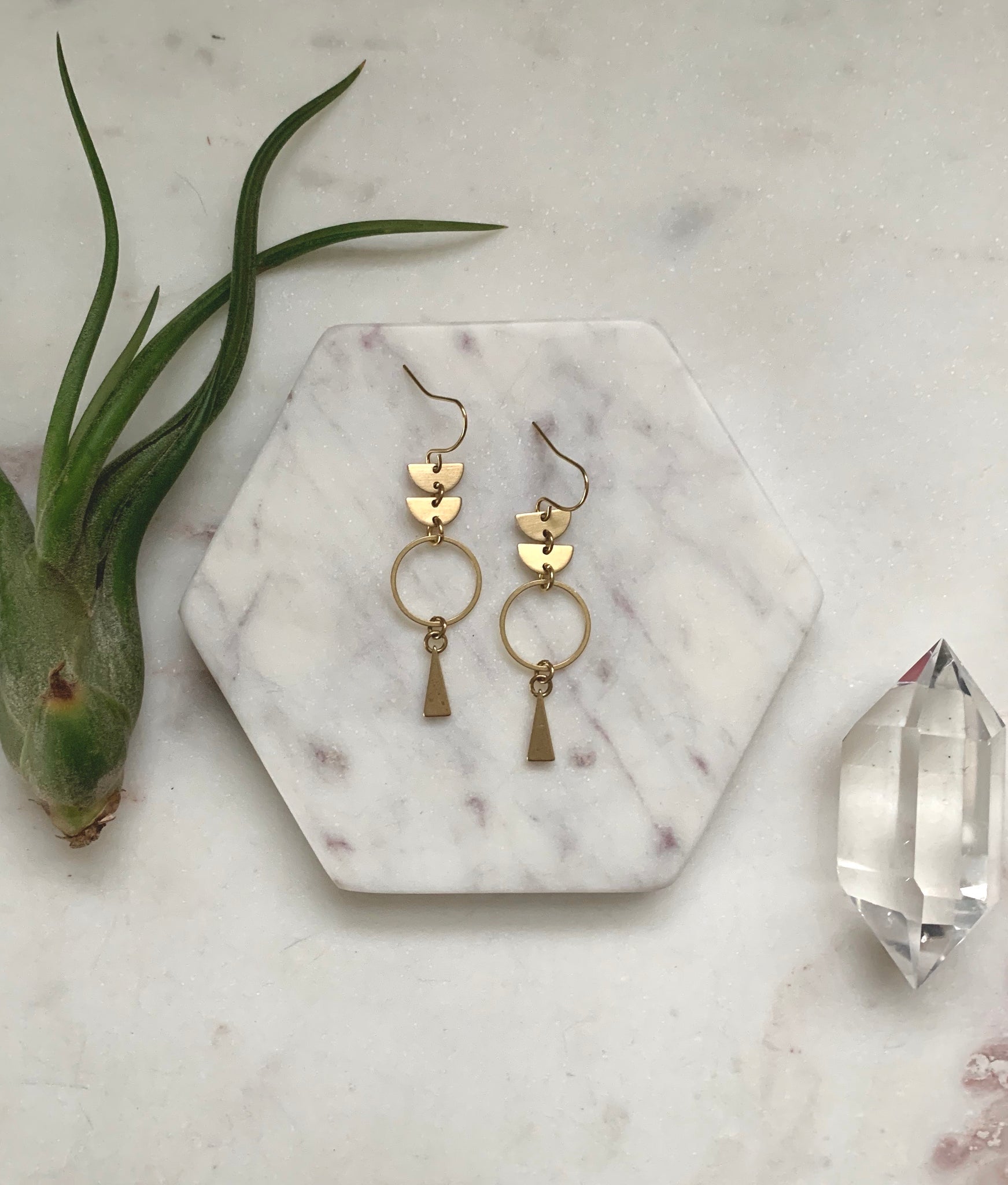 These geometric raw brass elements combined create these lightweight statement earrings