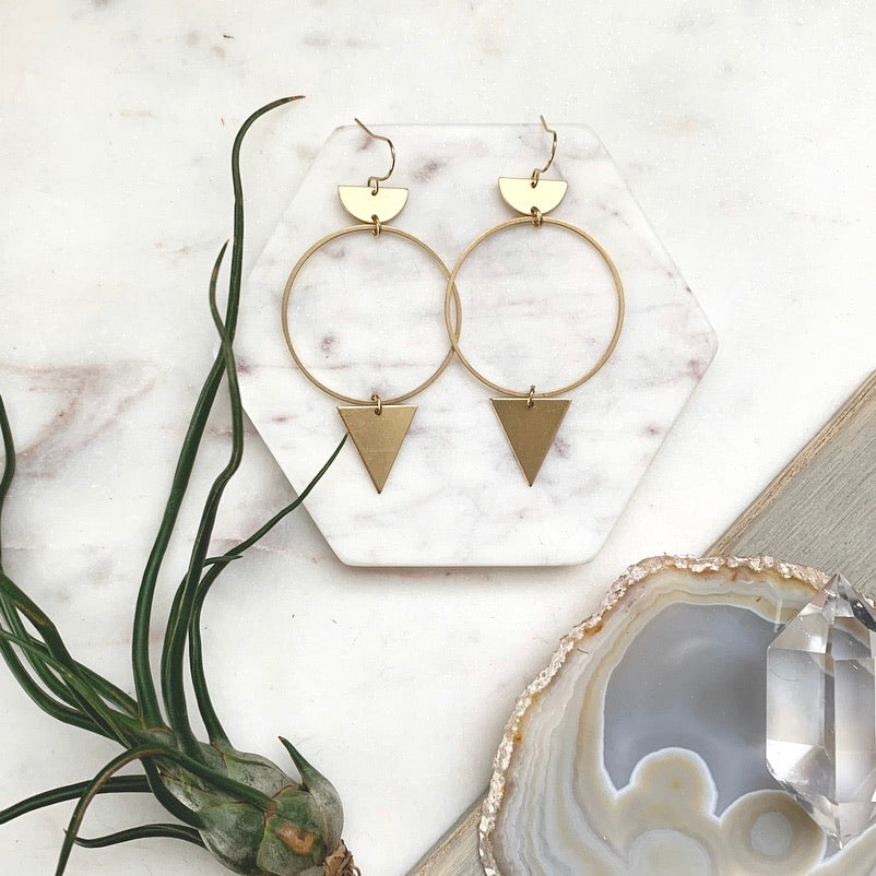Raw brass elements create these lightweight minimal earrings that measure approximately 3”