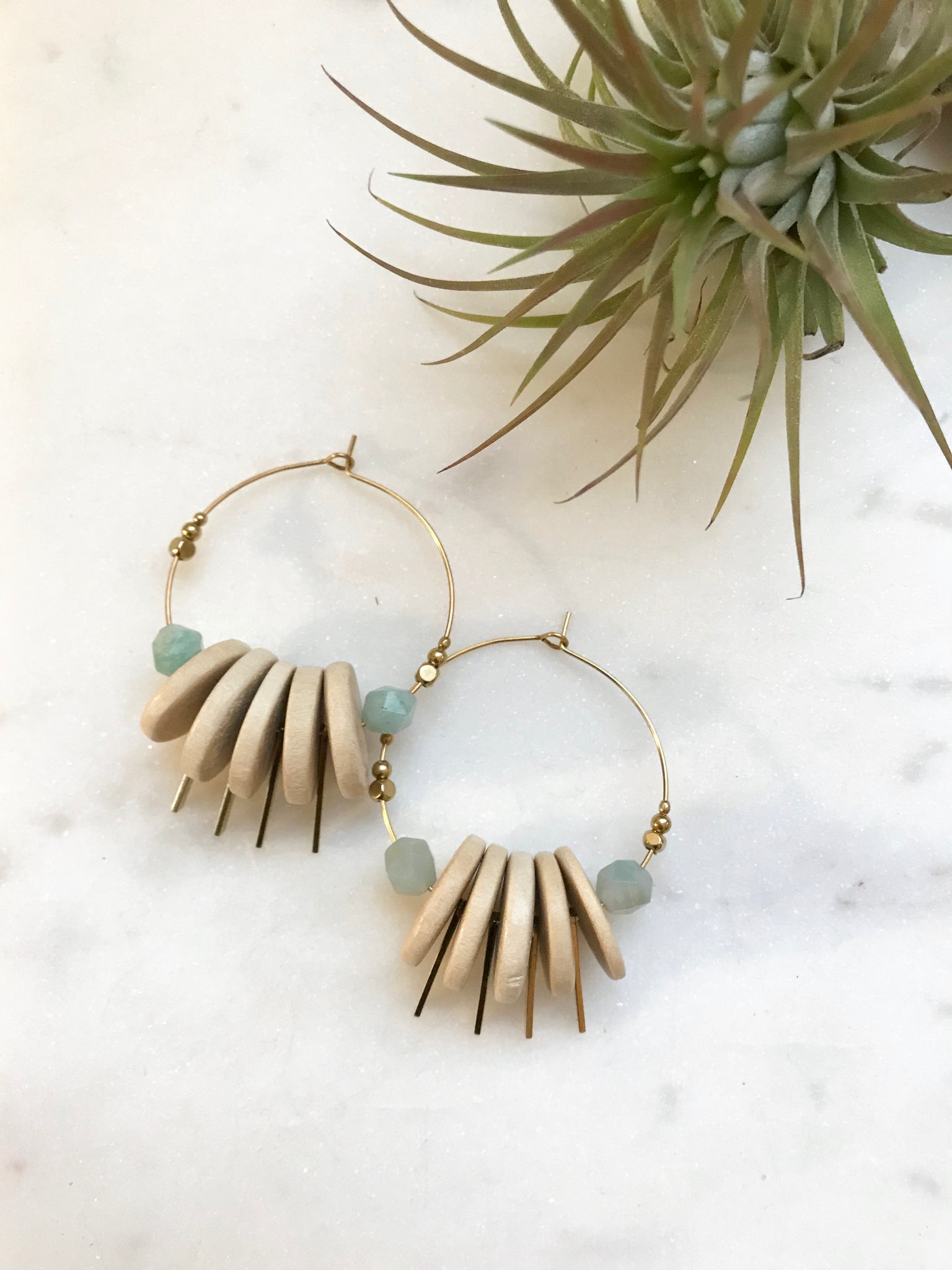 Hoops Style 1 on the left is accented with aquamarine beads and brass bars
