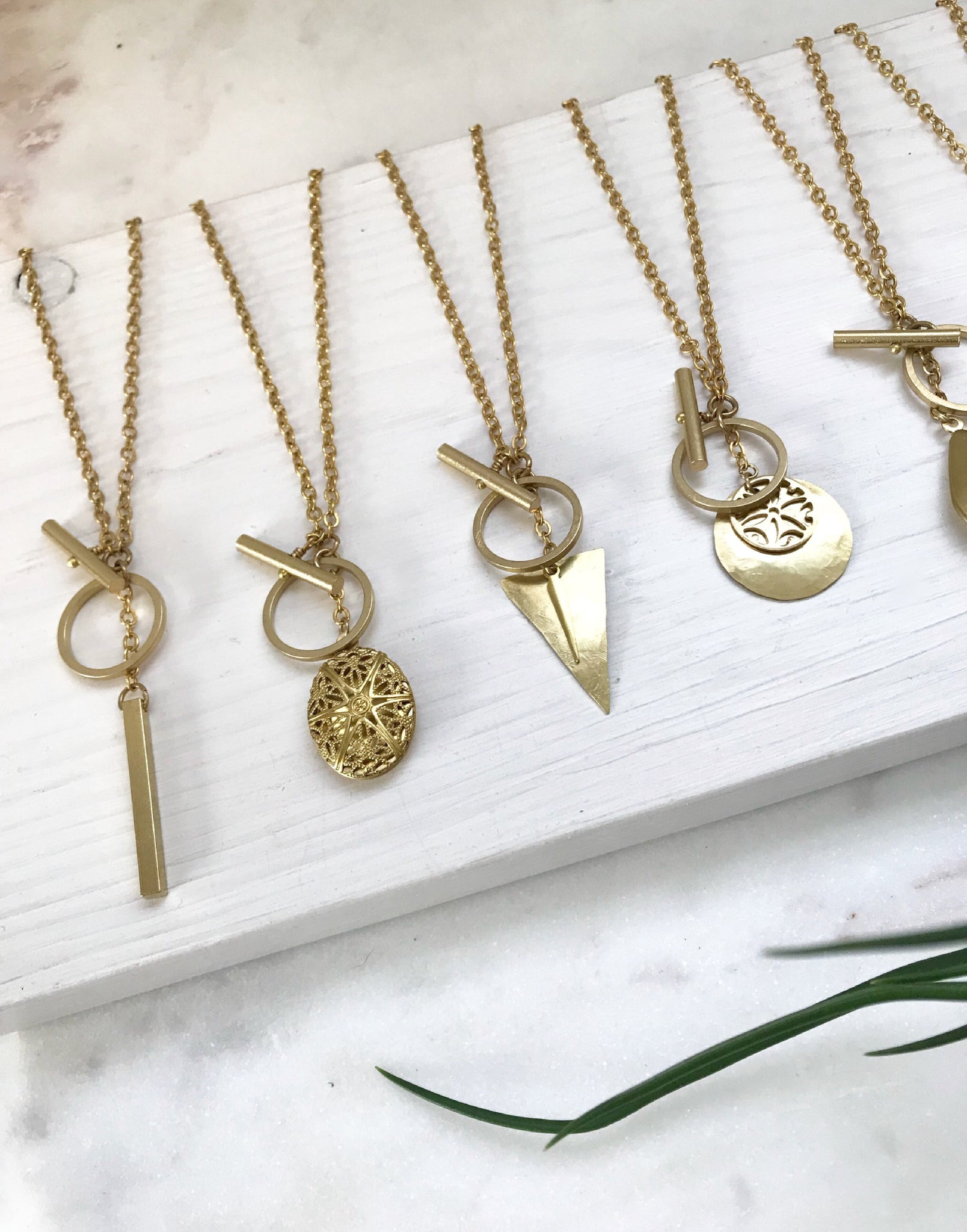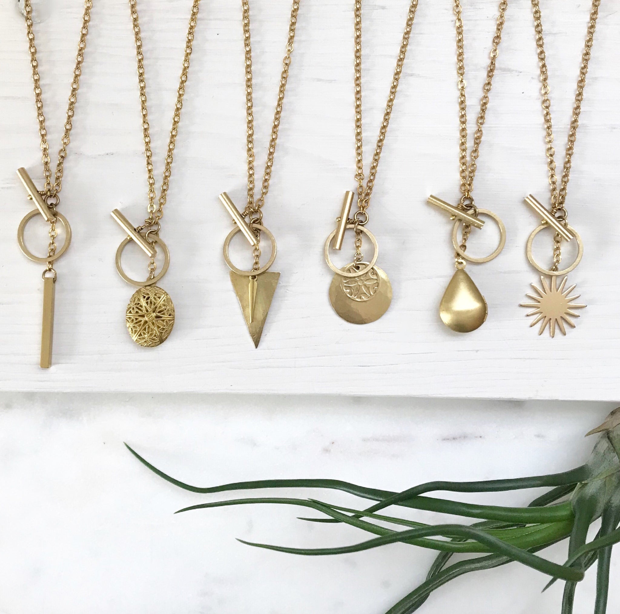 This necklace is made entirely of raw brass and measure 17" with two additional longer lengths.