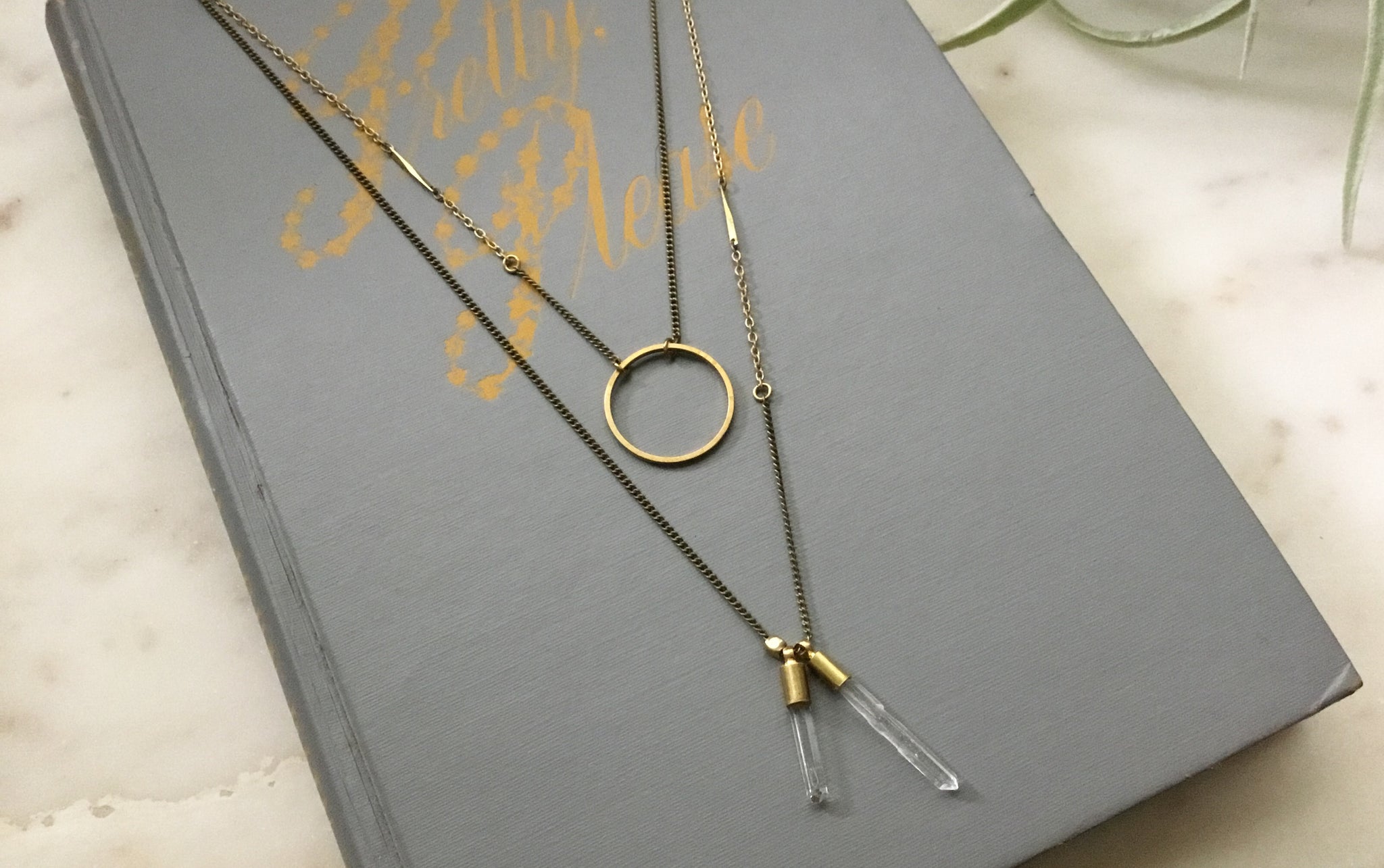 Whimsical Double Necklace made of mixed metal chain and accented with brass circle and the tiniest of crystals.
