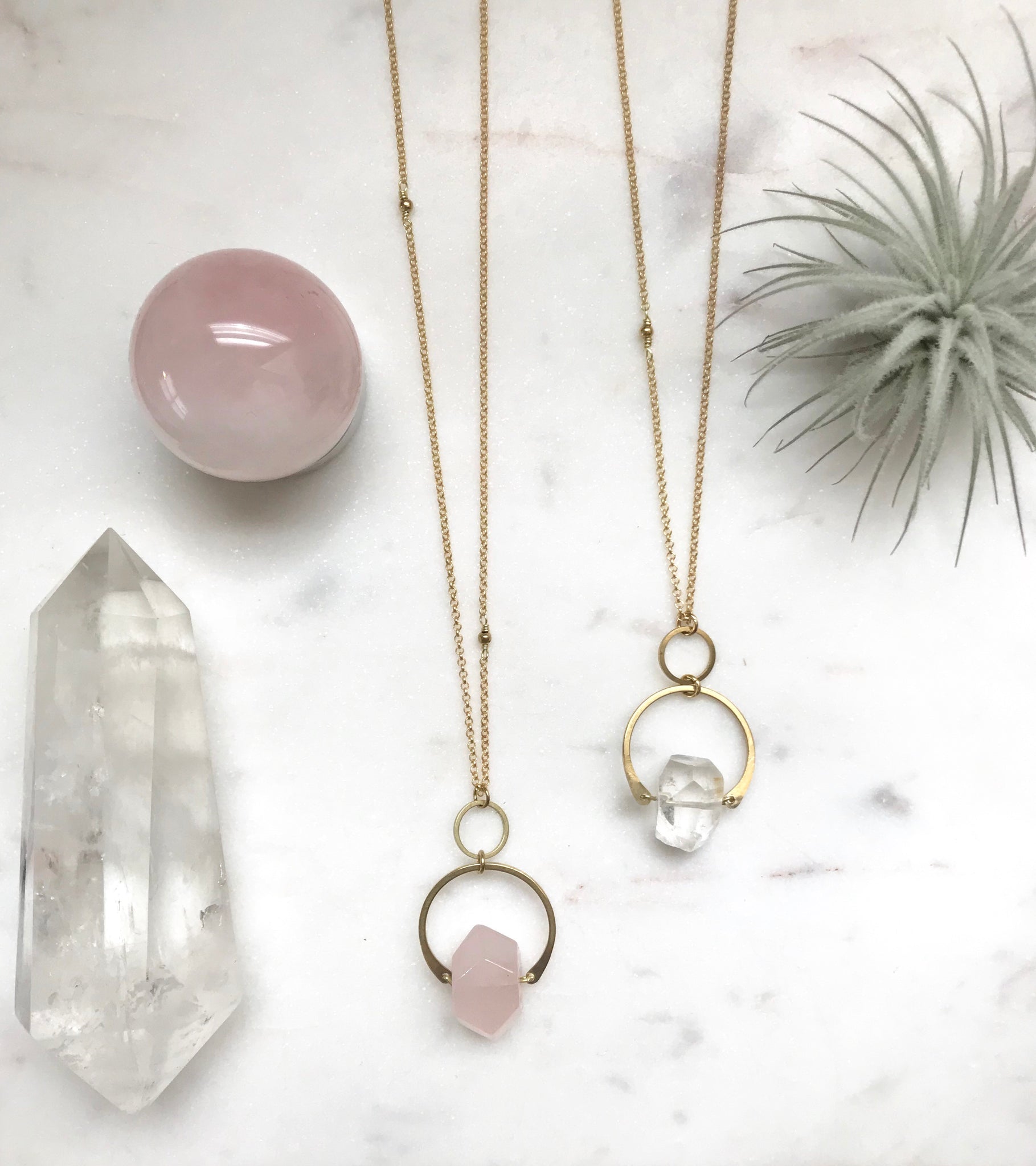 Rose Quartz & Quartz Crystal nuggets nestled in a brass curve.