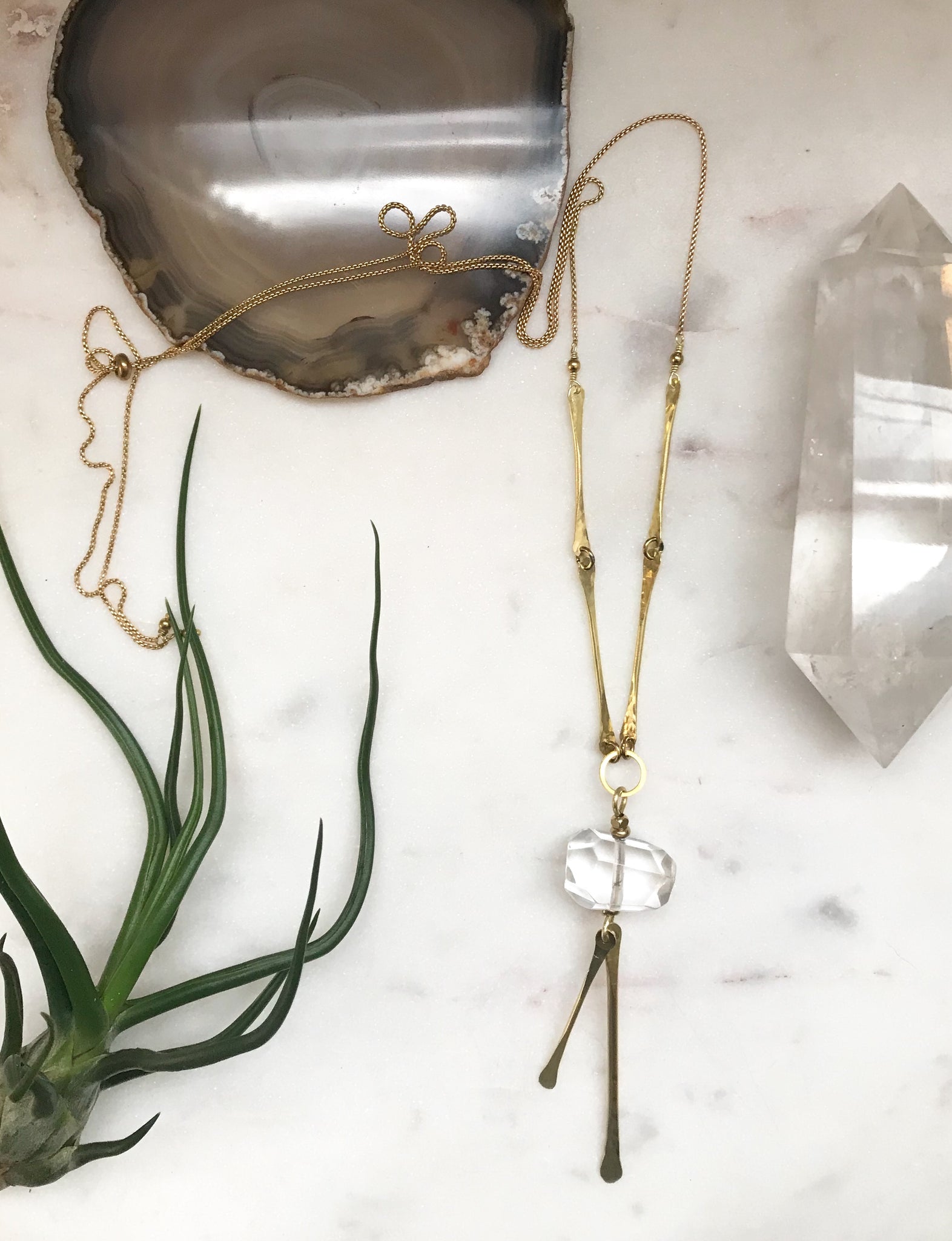 Made with hammered brass element and a stunning Quartz Crystal Nugget this necklace is the ultimate statement.