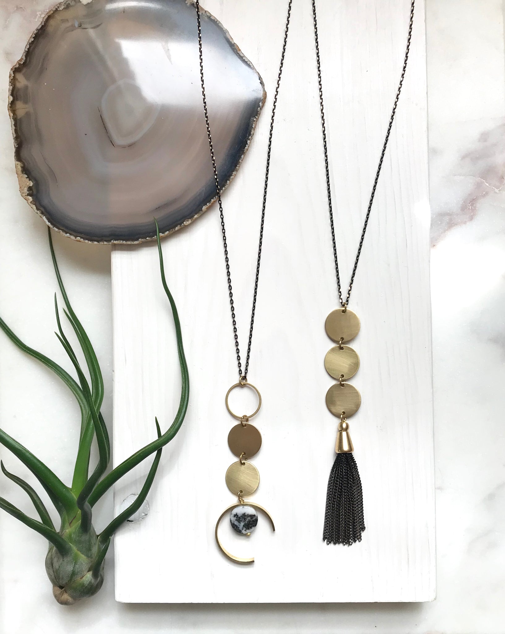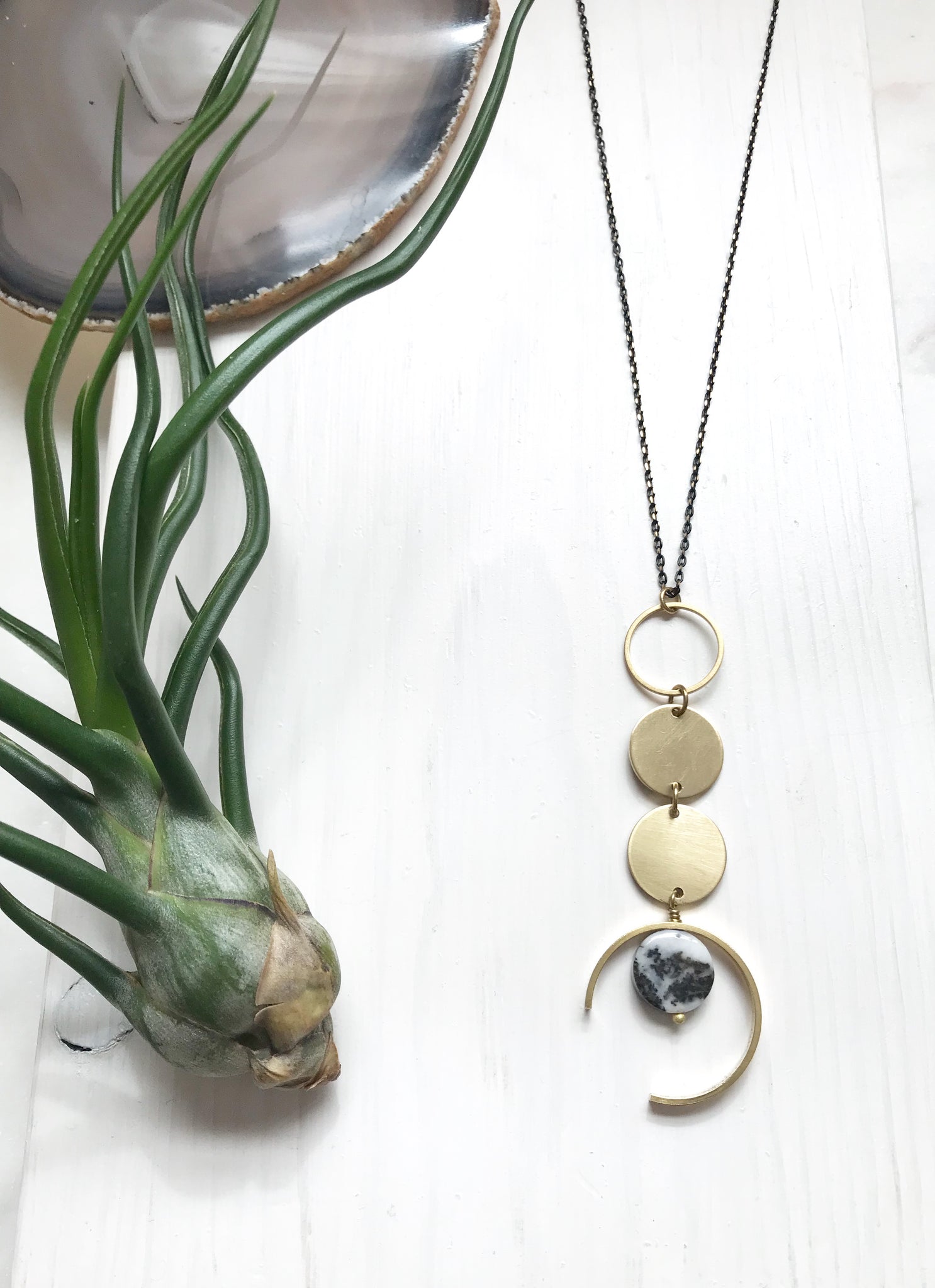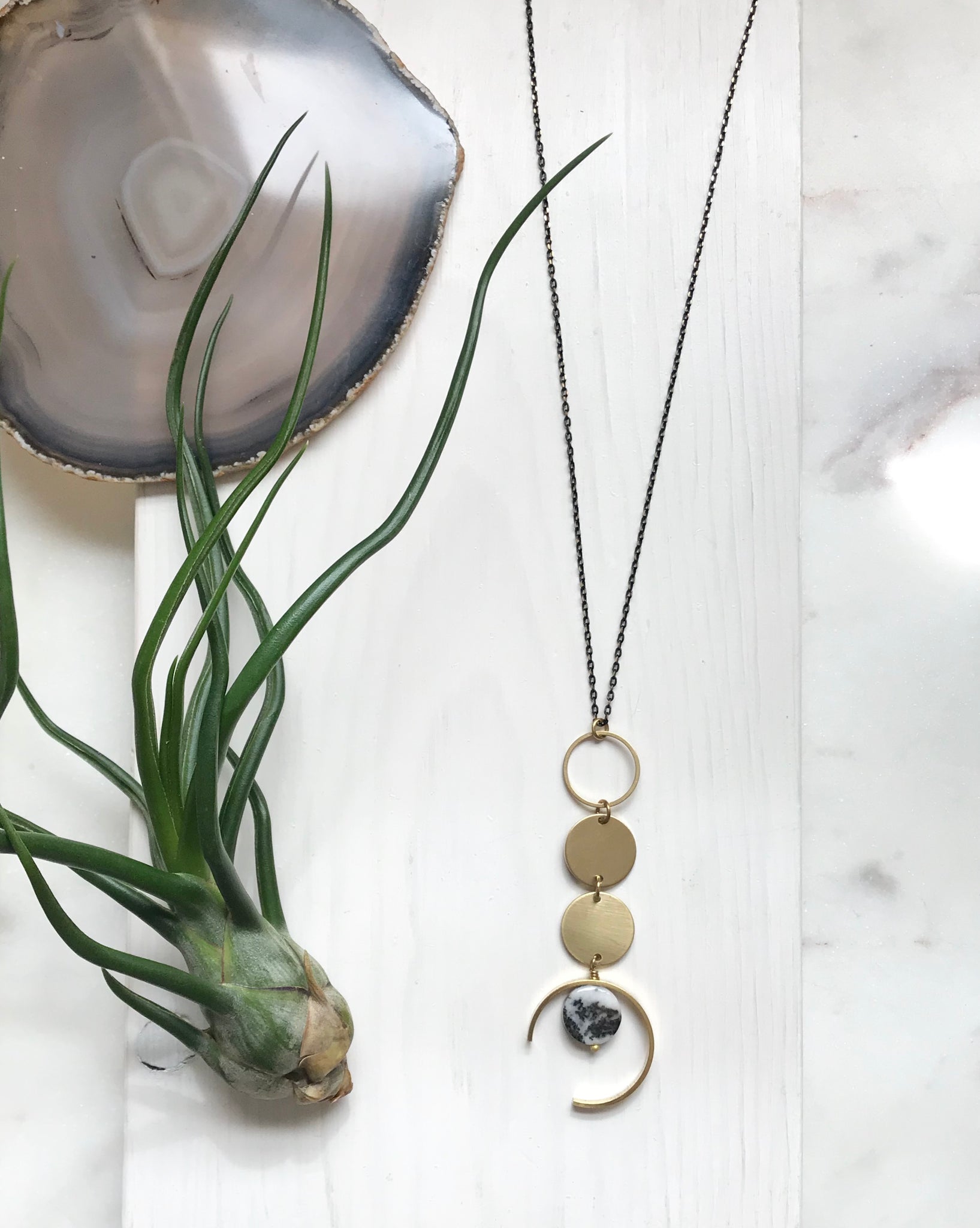 Multi circle + Semi Circle Talisman strung on black and gold chain.