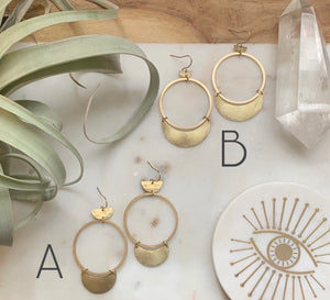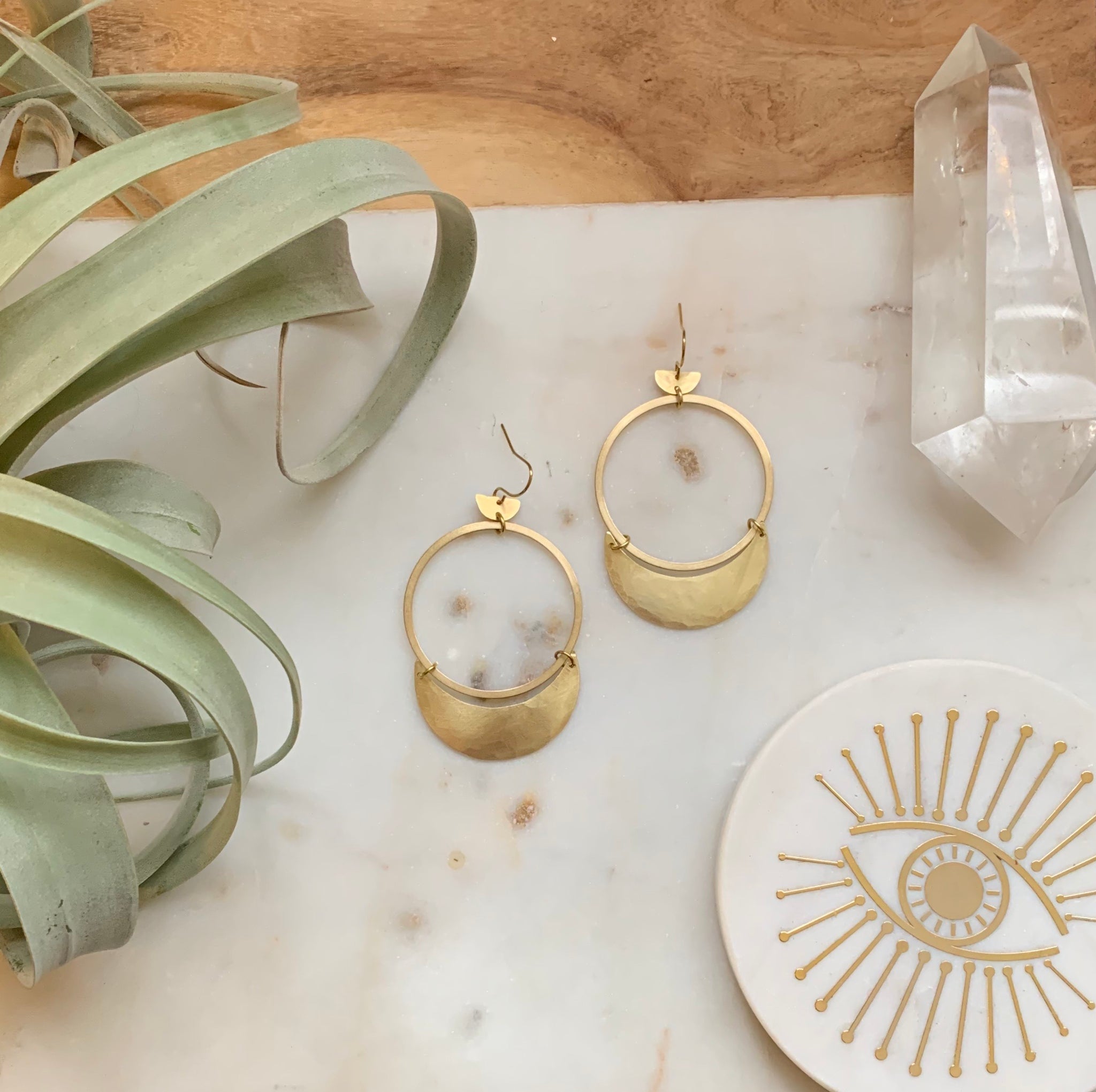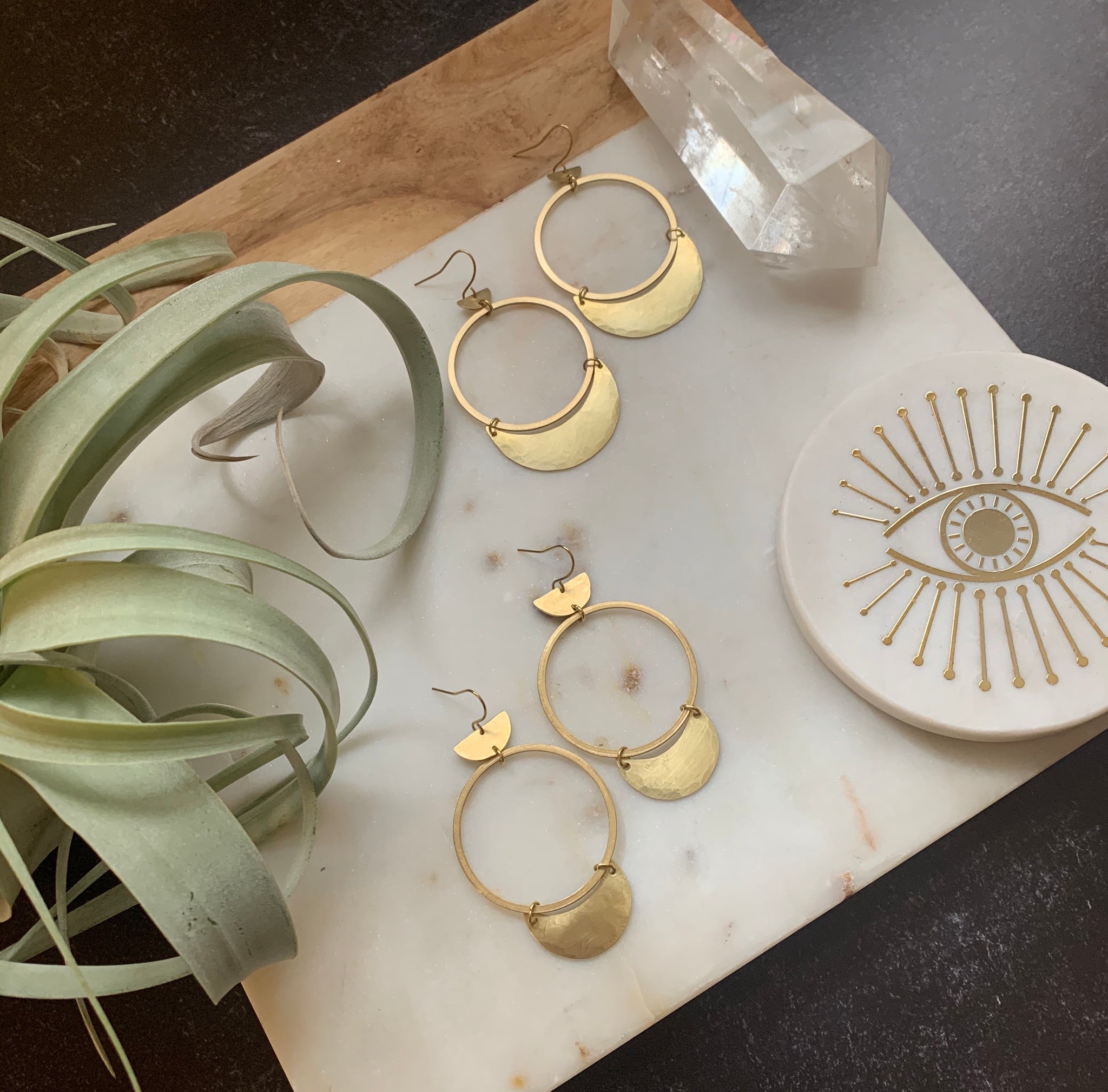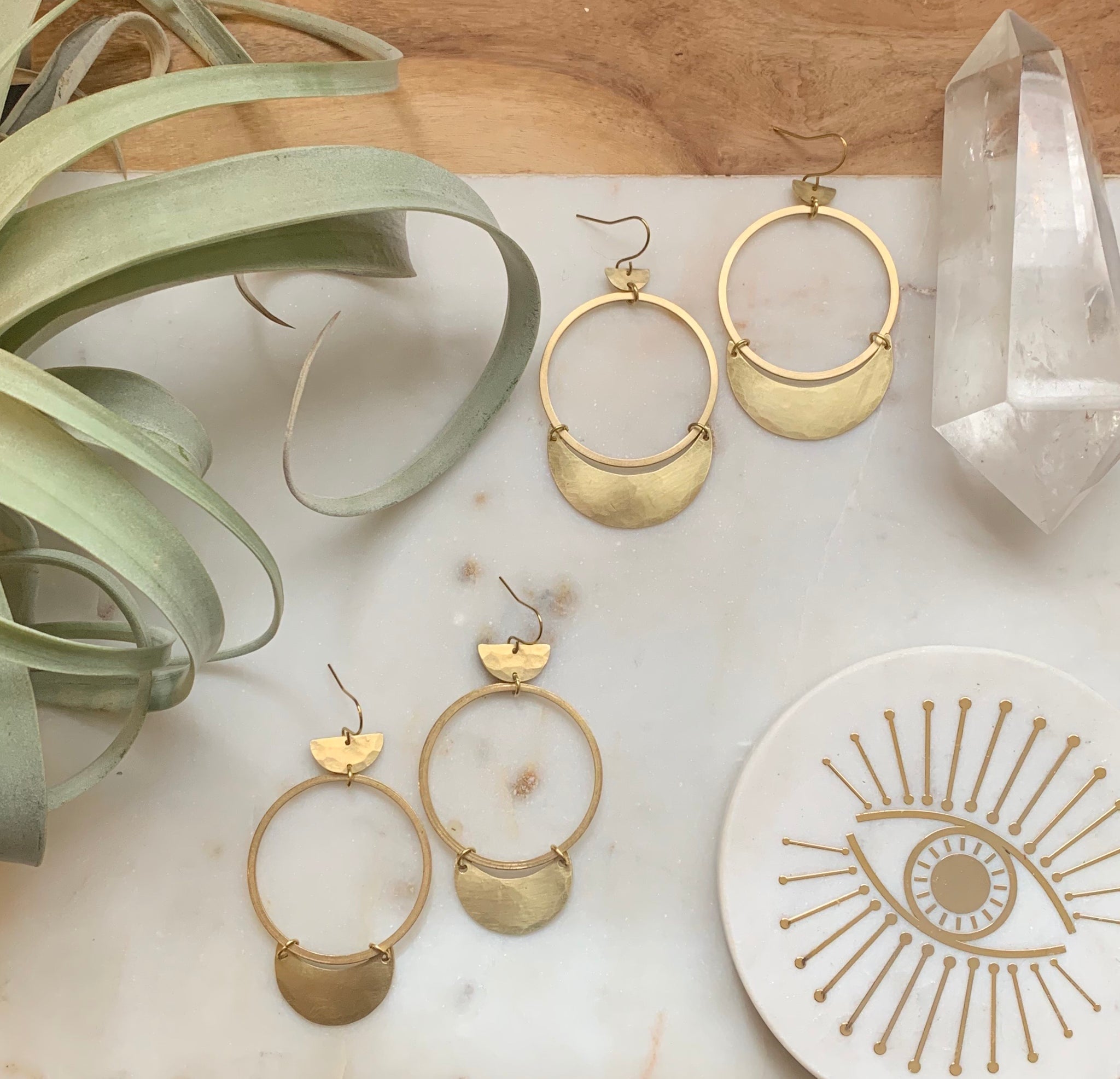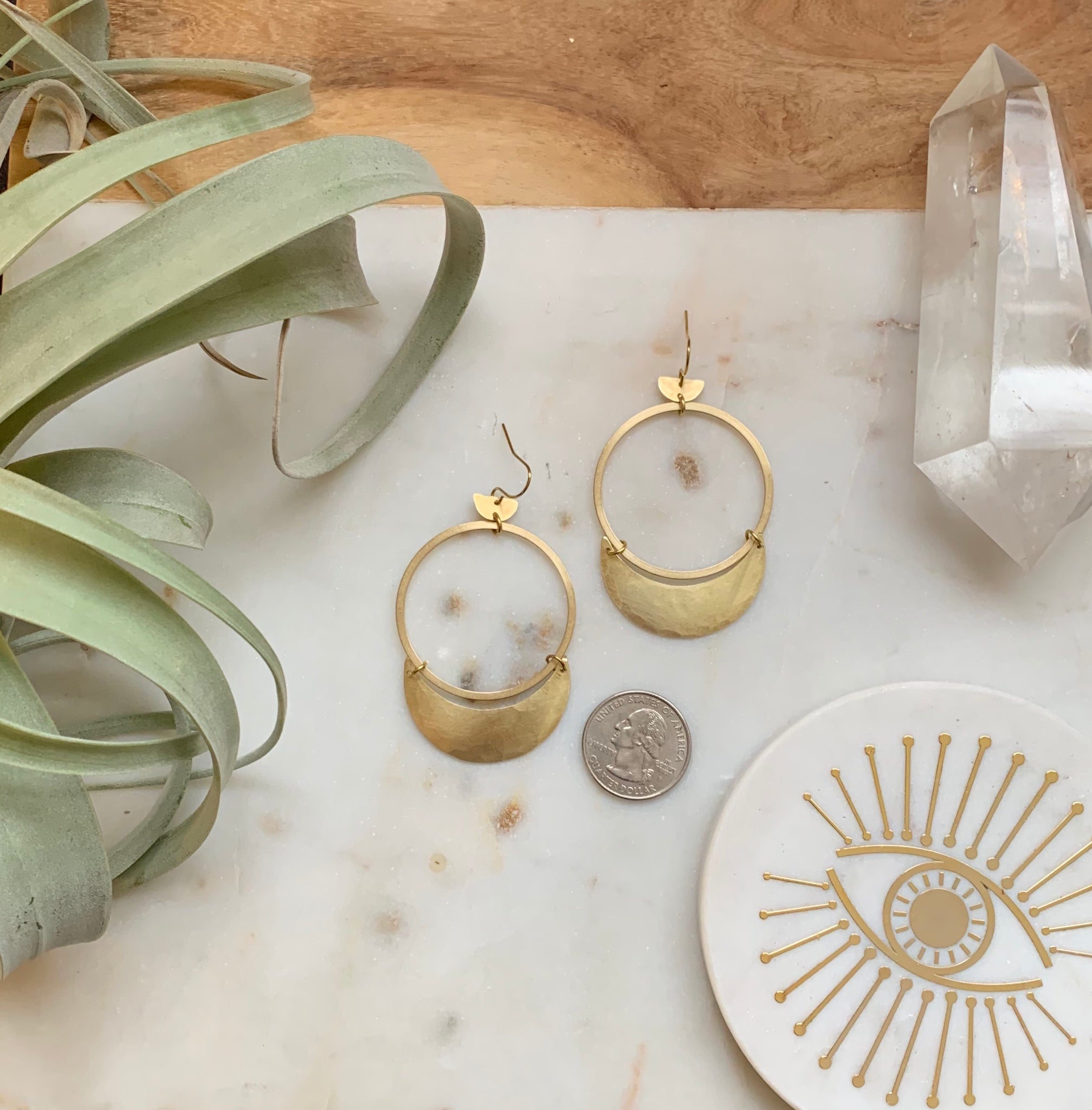 Raw Brass Elements are combined to create this crescent statement Hoops. They drop less than 3”